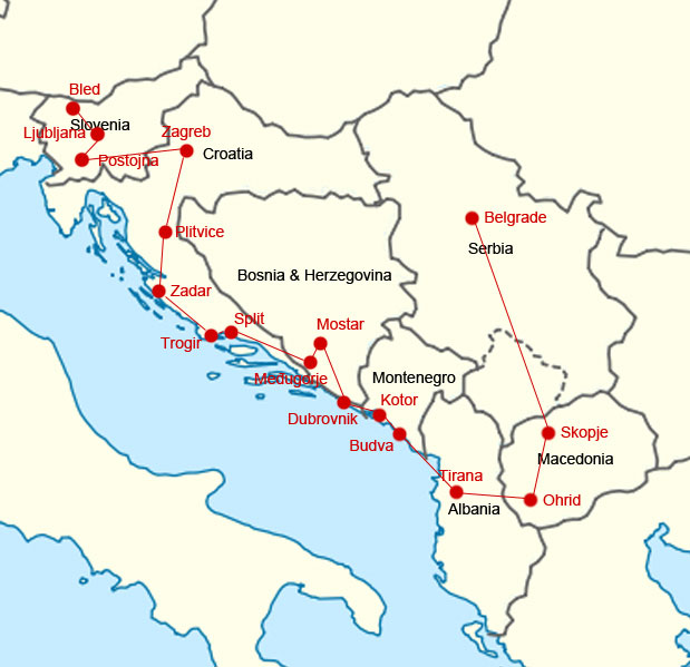 - Accommodation in 4 * hotels in Ljubljana, Zagreb, Zadar, Split, Mostar, Dubrovnik, Tirana, Skopje based on half board